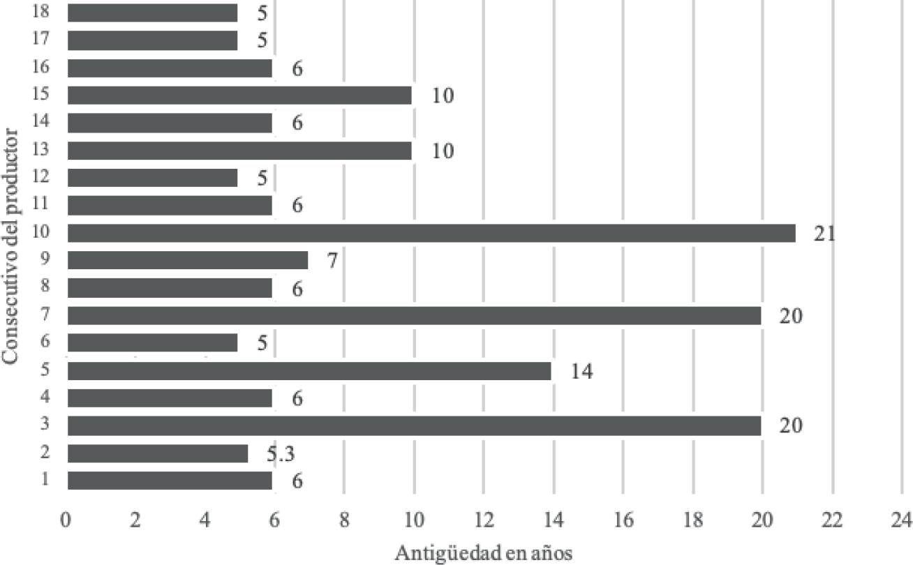 Se presentan los principales hallazgos de las respuestas de los productores de la región Sur de Jalisco. En la primera pregunta (Figura 1) se cumplió con el criterio de antigüedad mínima en el sector.