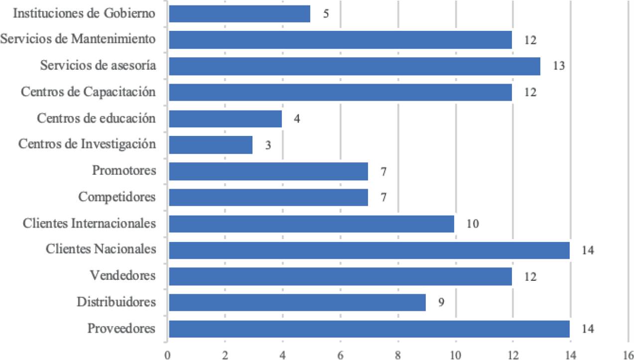 Los tipos de interacciones más comunes de las empresas son con sus clientes, proveedores y distribuidores (Figura 2), con quienes han establecido relaciones desde su arranque; sin embargo, destaca que también con instancias que ofrecen servicios de capacitación y asesoría.