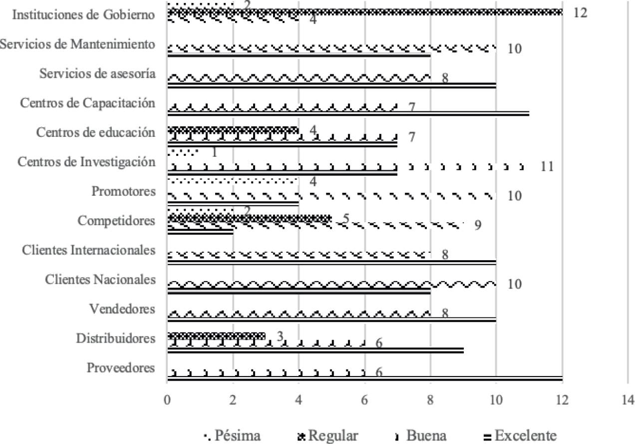Considerando lo anterior, los proveedores fueron los actores mejores evaluados, lo que nos muestra que se han establecido relaciones duraderas, de ganar-ganar para los socios de ambas. En el tema de relaciones, se constata la escasa relación con centros de investigación. En cuanto al factor de relaciones regulares, la de mayor frecuencia se encuentran las instituciones de gobierno, debido a que depende del candidato político y el interés en el sector. En concordancia con lo anterior, se indagó sobre los factores que inducirían positivamente en el establecimiento de relaciones con otras empresas (Figura 4).