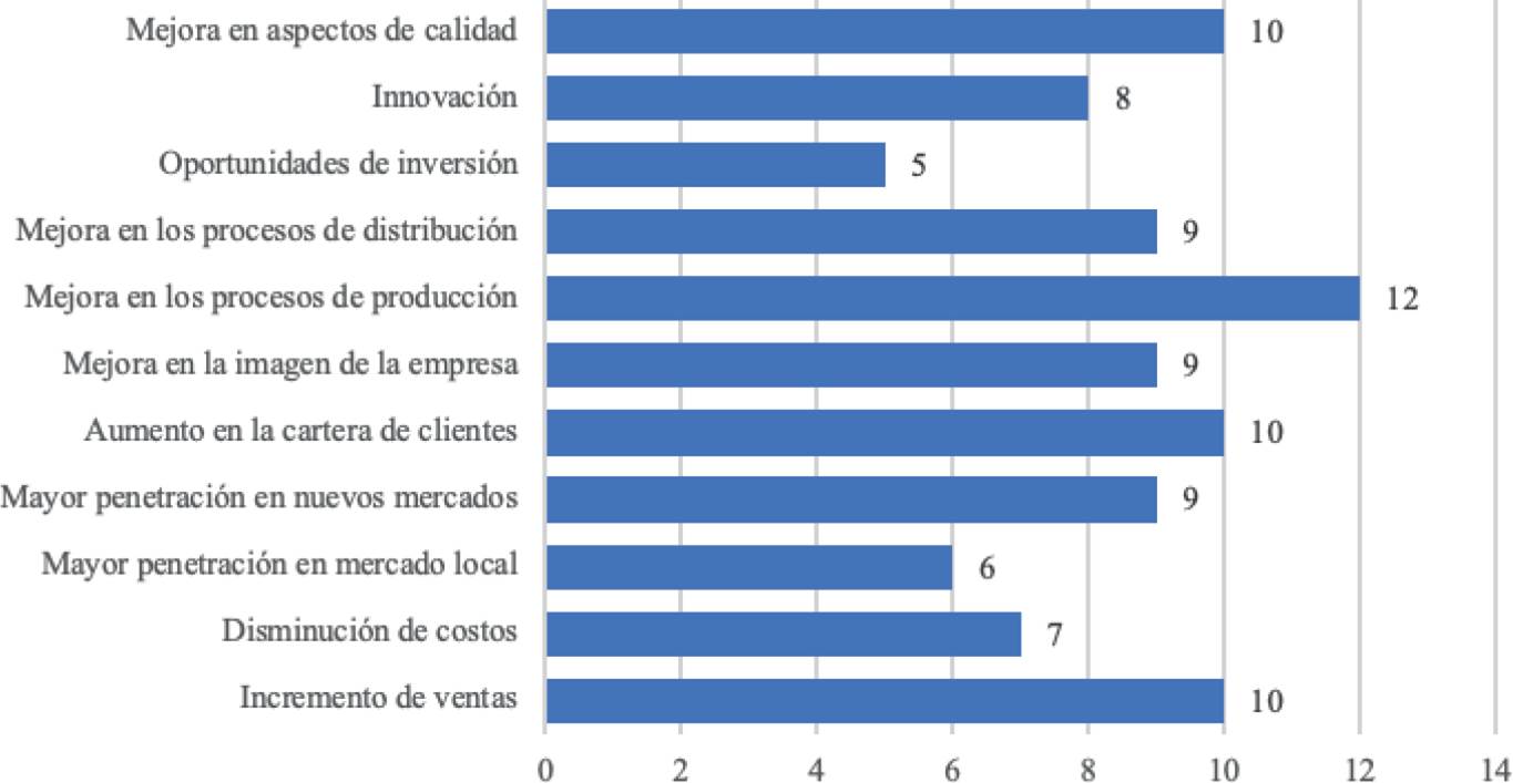Las empresas productoras seleccionaron los dos factores más importantes y determinantes de estas relaciones e interacciones: calidad y competitividad. Por el contrario, aspectos como la promoción, relaciones personales o apoyos de gobierno fueron los menos determinantes. De acuerdo con Álvarez,60 la promoción sería positiva y enriquecedora al consolidar el mercado estadounidense como receptor del producto, abriendo posibilidades de negocios y distribución en países europeos. En este contexto, en la pregunta siguiente (Figura 5) se obtuvo el testimonio de los beneficios de la integración entre productores.