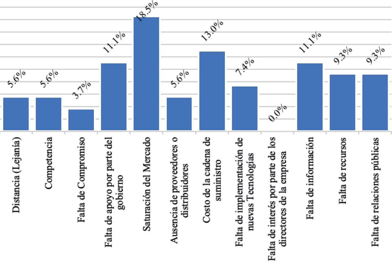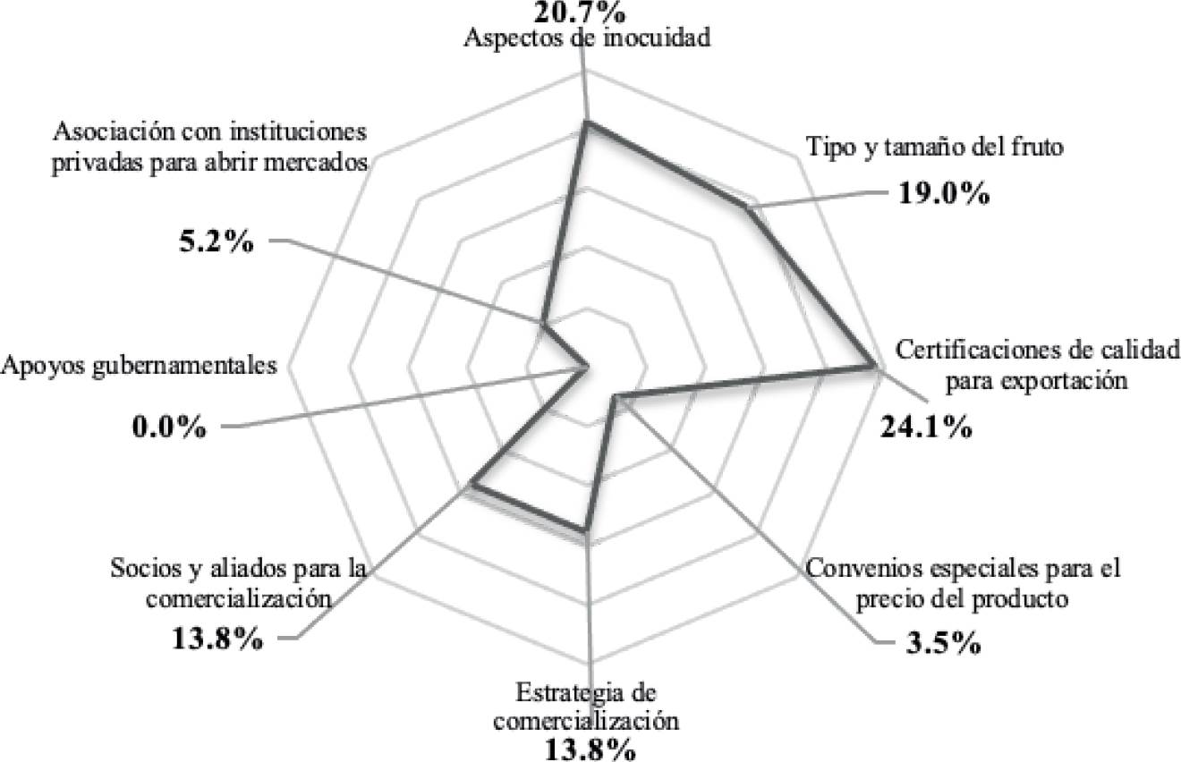 Tres aspectos se relacionaron con la calidad del producto, y concentran 64 % de las respuestas: la certificación de calidad para exportación, aspectos de y el tipo y tamaño del fruto. El sector productivo ha hecho esfuerzos por tener buenas prácticas ambientales, incluso aunque países a donde se exporta no pidan a los productores certificados que garanticen buenas prácticas. Los principales beneficios son la mejora en los procesos de producción, la competitividad, el incremento de las ventas y el aumento de la cartera de clientes. Actualmente, de acuerdo a datos de la Secretaría de Agricultura,61 la región Sur de Jalisco exporta a diferentes destinos internacionales, entre los que se encuentran Canadá, Japón, España, Emiratos Árabes Unidos, Rusia, Bélgica, Países Bajos, Francia, Reino Unido, Hong Kong, Arabia Saudita, Uruguay, Portugal, Alemania e iniciará con los Estados Unidos. Otra área de oportunidad a fortalecer que es relevante para las empresas es su relación con el exterior. En la Figura 7 se muestran las limitantes identificadas.