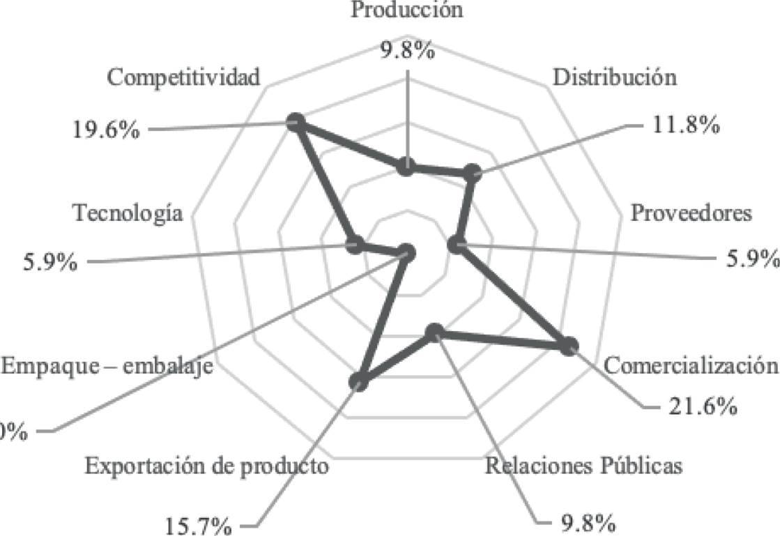 Esto se explica por la importancia del proceso de venta del producto. También se documentaron las principales problemáticas asociadas con la primera fase de producción, en orden de importancia: el control de plagas (37 %), sistema de riego y extracción de agua (31 %) y preparación de la tierra (20%), en menor medida el relacionado con la gestión del personal (11 % restante).