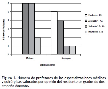 Conclusiones: la planta académica del hospital fue valorada por la opinión de los residentes como aceptable. Se encontraron diversos grados de desempeño docente que oscilaron entre suficiente y aceptable hasta excelente. Las especializaciones quirúrgicas fueron mejor valoradas en comparación con las médicas.