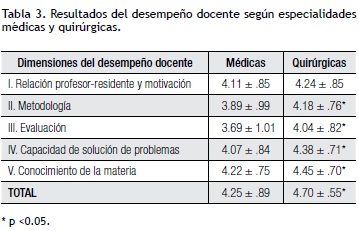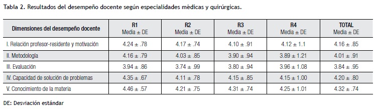 Results: Twenty-five teachers from 13 specialties were evaluated by 281 residents who stated that teaching performance is acceptable, with an average of 4.25 for medical courses, and excellent with an average of 4.70 for the surgical courses. The best valued dimension was "Knowledge of the course" with an average of 4.32 in contrast to the "Assessment" dimension with 3.84. It should be noted that the scores of the surgical specialties were statistically higher in 4 of the 5 dimensions as compared to medical ones (ANOVA) with the exception of dimension I corresponding to the "Teacher-resident relation and motivation".