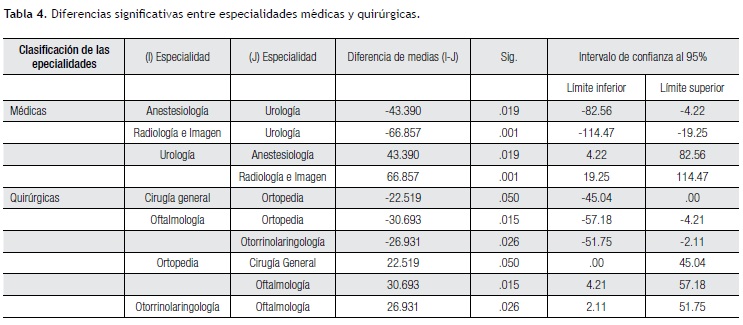 En la Tabla 4 se muestra el resultado de las valoraciones entre algunas especialidades médicas y quirúrgicas, en las que se encontró diferencia significativa mediante el ANoVA con alfa de 0.05 y la prueba de Tukey como post hoc.
