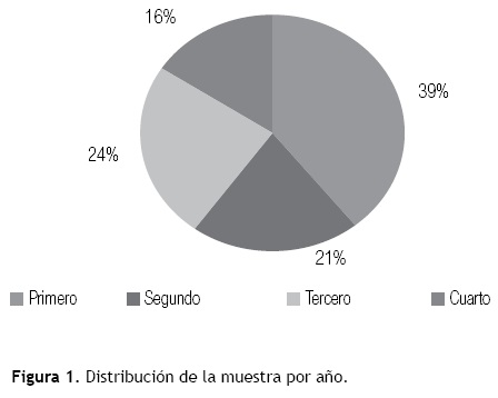 De primer año respondieron 1 309 de 1 555 inscritos (84%), de segundo 682 de 927 (73%), de tercer 806 de 850 (94%) y de cuarto año 531 de 802 (66%). La distribución de la muestra de la encuesta por año se presenta en la Figura 1. Con las bases de datos generadas se obtuvo información descriptiva, y a partir de ahí, se elaboraron tablas de contingencia para explorar asociaciones estadísticamente significativas en el uso del tiempo de los alumnos regulares e irregulares, con la prueba estadística de ji cuadrada2 (p<0.05).