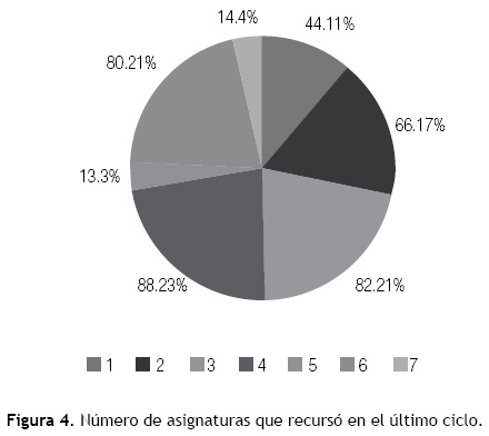 De 3 029 encuestados, 13% fueron recursadores, de los cuales 80.7% estaban en primer año, y 70.2% eran mujeres, 50.6% tenían promedio de calificaciones menor de 7, en comparación con el 17.2% de los regulares (p=0.00). En la Figura 2 se muestran los alumnos regulares e irregulares por año, y en la Figura 3 el promedio de calificaciones de alumnos regulares e irregulares. El número de asignaturas que repitieron los estudiantes en el ciclo anterior, al que estaban inscritos en ese momento se presenta en la Figura 4. Ha sido política de la FM que quien reprueba una materia obligatoria no puede pasar al siguiente año, debe repetir y aprobar dichas asignaturas para continuar con la licenciatura. Esto explica en parte el elevado número de recursadores, sobre todo en el primer año.