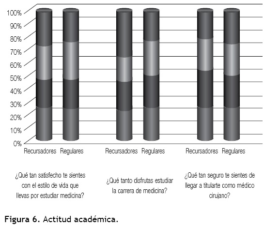 Se encontró asociación estadística (p<0.05) entre algunos problemas académicos y ser recursador, tales como: 1) la dificultad para entender textos médicos, 2) dificultad para buscar apoyo en libros adicionales o internet, 3) la necesidad de asesoría para organizar su tiempo, y 4) dificultad para realizar maniobras clínicas (Figura 5). Los repetidores se mostraron inseguros de terminar la licenciatura, expresaron disfrutar menos sus estudios y se sintieron poco satisfechos con su estilo de vida por estudiar Medicina (Figura 6).