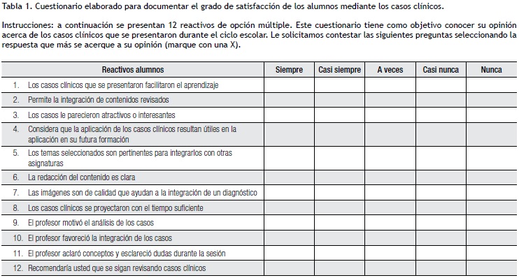 Conclusiones: Con base en los resultados obtenidos, puede afirmarse que la revisión dirigida de "caso clínico", tuvo una satisfacción como herramienta didáctica tanto por los alumnos como por los profesores en el proceso de enseñanza-aprendizaje.