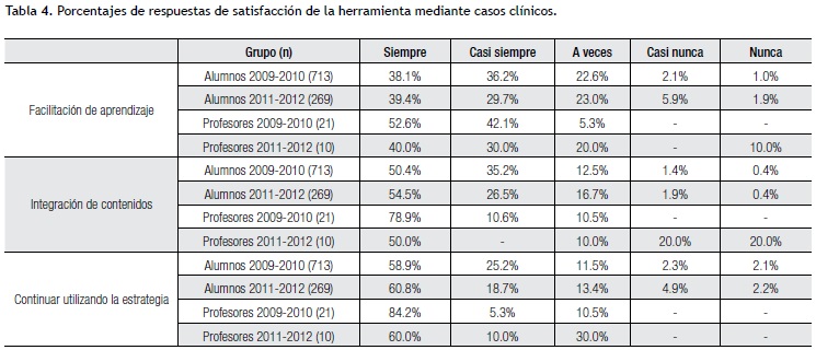 En nuestro estudio las opiniones negativas fueron menores al 20% (categorías "nunca" y "casi nunca") en los dos años, tanto en los profesores como en alumnos, lo cual habla indiscutiblemente de la gran satisfacción obtenida con los casos clínicos.