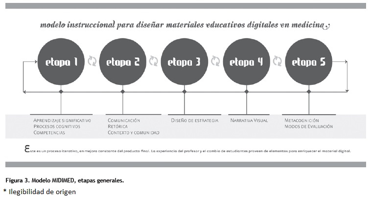 Por otro lado, se observa que los avances teóricos para el diseño de materiales educativos digitales se han desarrollado por líneas separadas: el diseño instruccional por un lado, los diferentes tipos de diseño (diseño de información, diseño de experiencias, diseño de interfaz, diseño gráfico) por otro, y finalmente, la práctica por un tercer camino. Con la intención de romper esta disociación y apoyar al docente de Medicina de pregrado, se generó el Modelo instruccional para Diseñar Materiales Educativos Digitales para Medicina (MIDIMED), que integra los hallazgos del diseño instruccional, y de otras áreas del diseño, y se alineó de acuerdo a las ideas de la teoría constructivista, bajo las cuales las personas construimos el conocimiento basado en lo que sabemos, y el aprendizaje es un proceso activo.5