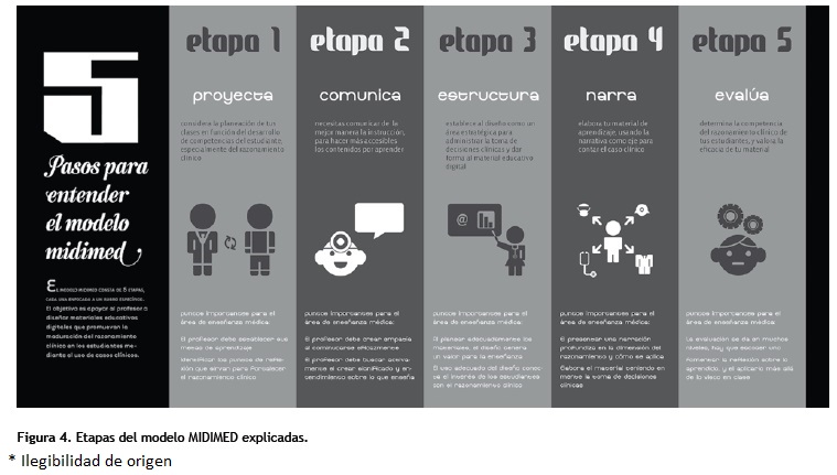 Se concluye que la aportación y apoyo en la práctica docente en Medicina que involucra el MIDIMED, en donde se combinan las aportaciones de diferentes perspectivas del campo del diseño, para la creación de experiencias de aprendizaje digitales que fomenten el razonamiento clínico, es una gran oportunidad que vale la pena explorar, en tanto sus beneficios pueden impactar el cómo los profesores médicos diseñan sus materiales para clase, haciéndolos apropiados y efectivos para la enseñanza preclínica.