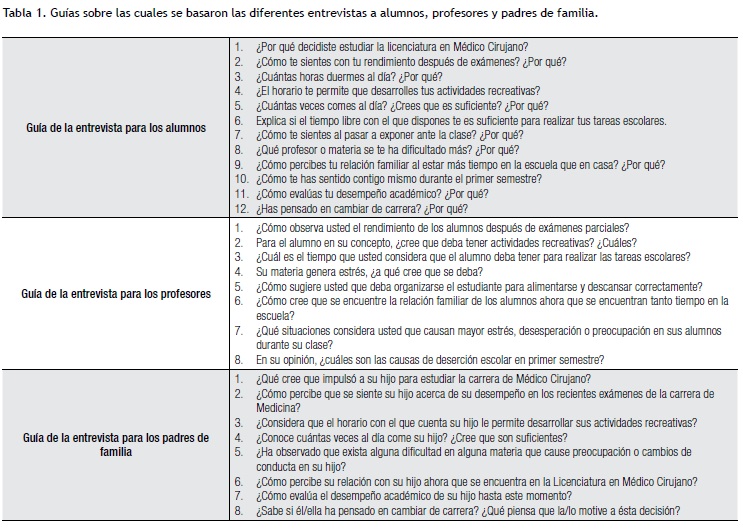 En este estudio buscamos conocer la percepción de los estudiantes de primer semestre de Medicina, sus padres y sus profesores, sobre los factores estresantes en el día a día de los propios estudiantes. Para ello, diseñamos una "guía de entrevista" (Tabla 1); las preguntas de esta guía responden a los cuatro aspectos fundamentales que abarcan todas las modificaciones a las que se ve expuesto el estudiante en este periodo tan crítico; las preguntas se diseñaron con base en la literatura revisada del tema y los instrumentos ya existentes para indagar la temática en estudio, previa a la validación con expertos.