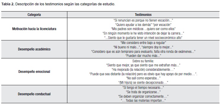 Fueron entrevistadas 27 personas, de las cuales 10 eran estudiantes de Medicina de primer semestre, 9 catedráticos de la carrera y 8 padres de familia de los mismos estudiantes. En primer lugar, los entrevistados refirieron que los motivó para estudiar la carrera de Medicina el "ayudar a los demás" y "por vocación"; el motivo más frecuentemente expuesto del porqué los estudiantes decidieron estudiar Medicina fue por "querer ayudar a las personas", seguido de "gusto por las ciencias naturales" y en tercer lugar fue por "tener padres médicos" (Tabla 2).