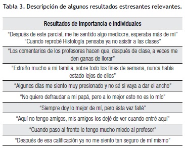 En la entrevista también pudimos darnos cuenta que, a pesar de no poder realizar actividades recreativas, los estudiantes están a gusto con su tiempo para realizar tareas: "sí tengo el tiempo necesario...", "se trata de organizarse..." fueron algunas de las respuestas con lo que sus profesores y padres concordaron: "se deben organizar correctamente..." "...todas las materias importan". Uno de los estudiantes mencionó "duermo a mis horas y siempre como con mi familia...". Por otra parte, pudimos constatar que los estudiantes sienten estrés por una materia del primer semestre en particular, Histología, por la presión del profesor y la cantidad de información a la que están sometidos "es demasiada información que procesar...", "me fue bien en todas menos en esa..."; en sus casas se habla de esta situación por lo que los padres también comentaron: "...está molesto (el hijo) por su calificación en Histología". Los mismos catedráticos también reconocen que es una cantidad considerable de información a procesar en tan poco tiempo, aunque otros profesores consideran que si se llega a producir estrés, es por falta de estudio "...se sienten preocupados, porque no estudian lo suficiente" (Tabla 3).