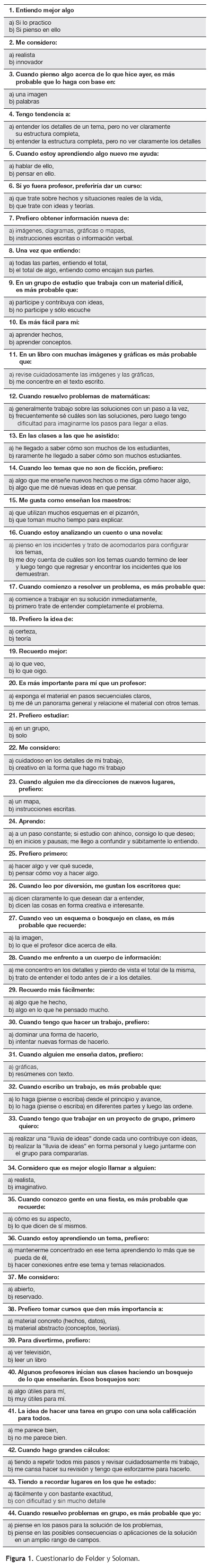 Para realizar la evaluación de los estilos de aprendizaje, se usó el cuestionario desarrollado por Felder y Soloman (Figura 1). El cuestionario consta de 44 reactivos con respuestas dicotómicas (a o b), y considera cuatro escalas, una para cada dimensión del modelo de Felder-Silverman: Activo-Reflexivo (modo de procesar la información), Sensitivo-intuitivo (tipo de información mejor percibida), Visual-Verbal (manera en que la información sensorial es percibida) y Secuencial-Global (progreso hacia la comprensión de la información). Cada escala consta de 11 preguntas distribuidas al azar. La puntuación de cada una de ellas se obtiene contando el número de respuestas a y el número de respuestas b, luego se substrae el número menor del mayor y al número que resulte se le coloca la letra predominante. Las respuestas con letra a corresponden al primer polo de cada una de las cuatro escalas, mientras que las respuestas con letra b corresponden al segundo polo. Una puntuación de 1 a 3 indica un balance entre las dos dimensiones de la escala y por tanto, el alumno puede aprender con métodos de enseñanza que favorezcan ambas dimensiones. Una puntuación de 5 a 7 señala una preferencia moderada por una dimensión de la escala, lo cual sugiere que un estudiante aprende más fácilmente con métodos de enseñanza ón. Una puntuación de 9 a 11 indica una fuerte preferencia por una dimensión de la escala y de acuerdo con Felder, dicho estudiante tendrá dificultades para aprender bajo métodos de enseñanza que no apoyen esa dimensión.