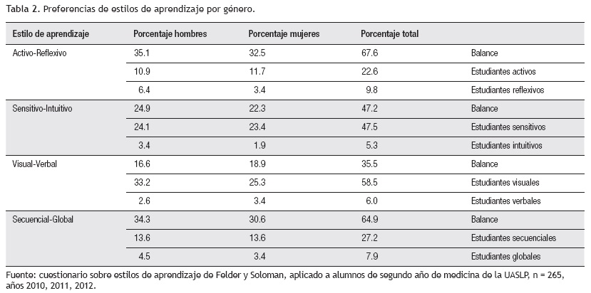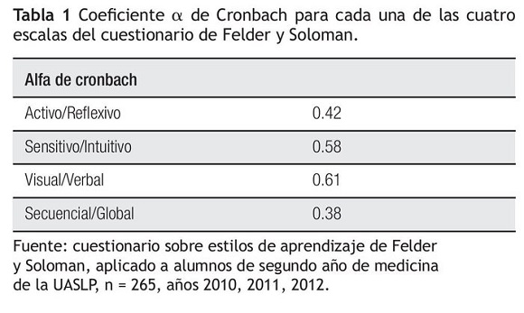 Methods: This research was conducted in a group of second-year medical students attending the Gastrointestinal Physiology theory and laboratory sessions of the Human Physiology course during the 2009-2010, 2011-2012 y 2012-2013 school years. Felder and Soloman's questionnaire was applied to 459 students and it was answered completely by 265 students (126 women and 139 men). At the end, the reliability of the questionnaire was calculated.
