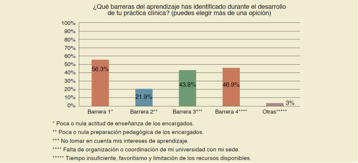 De los 3 terapeutas adscritos al hospital, solo 1 refirió como “muy bueno” a la enseñanza durante las prácticas clínicas en fisioterapia, mientras que los 2 restantes respondieron como “bueno” y “regular” respectivamente; adicionalmente, los 3 profesionales consideran estar de acuerdo con el uso de metodologías y estrategias pedagógicas; sin embargo, únicamente el 33.3% (1/3) de los encuestados los aplica regularmente para el desarrollo y conclusión de habilidades en los estudiantes, optando el 66.6% (2/3) por una metodología tradicional y el 100% (3/3) por Aprendizaje Basado en Problemas (ABP) dentro de sus estrategias pedagógica. Adicionalmente, los adscritos coincidieron en que las barreras sociales, organizativas y actitudinales obstaculizan la conclusión del aprendizaje, como muestra la Figura 4.