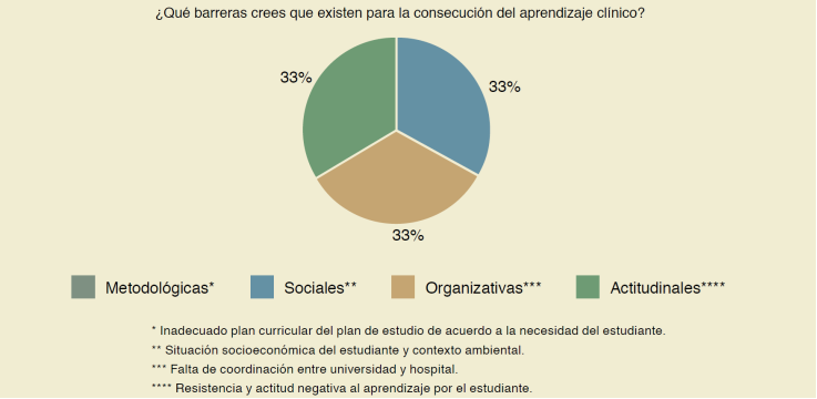 En complemento, el 66.7% (2/3) de los educadores resaltó que la actitud y motivación del estudiante facilitan la propia conclusión del saber, mientras que el 33.3% (1/3) considera que la coordinación universidad y hospital ayudaría aún más a dirigir la enseñanza de la clínica.