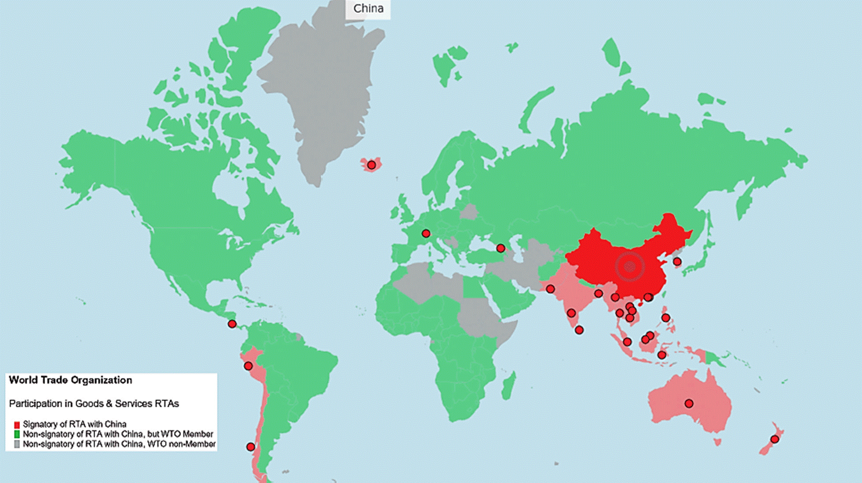 Thanks to the impact of the Open-Door Policy, the Chinese economy was able to grow in an already globalized world. Moreover, in 1986 China started the process to obtain its GATT/WTO membership, in what became the longest process in the history of the institution -China was admitted until 2001-. During the first decade of China’s membership in the WTO, Chinese authorities tried to change the perception of the nation’s economy for it to be recognized as a market one using the strategy of RTAs aiming to avoid anti-dumping investigations (Gao, 2010).
