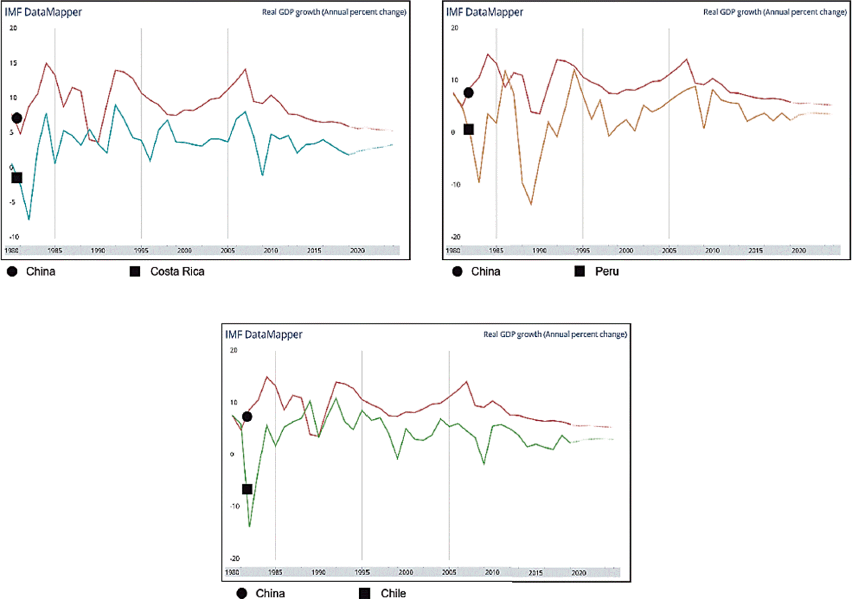 Figure 2 Real GDP comparison between China and Costa Rica, Peru and Chile