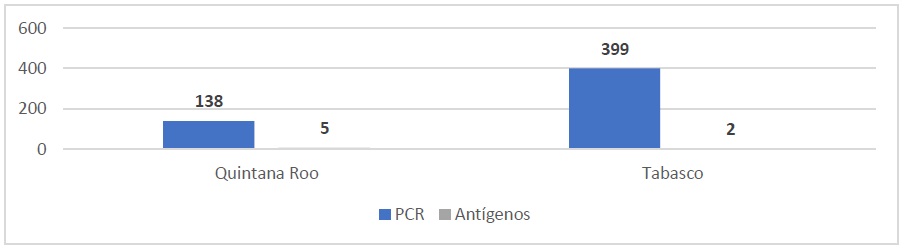De igual forma en Tabasco, la mayoría de pruebas fueron PCR, mientras que sólo 2 fueron de antígenos, 278 hombres y solo 123 mujeres.