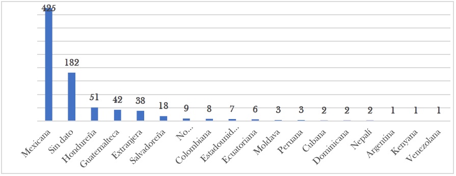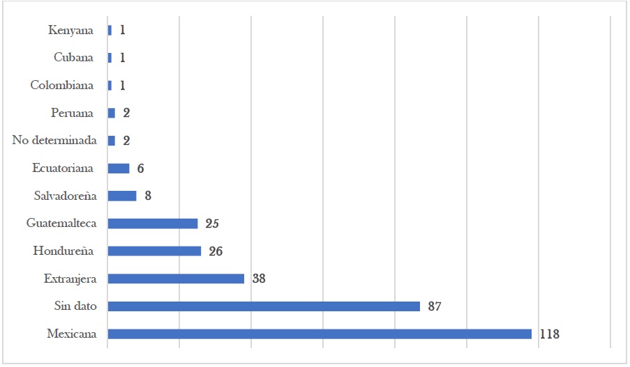 Vemos que la nacionalidad que más registros tuvo de personas agraviadas fue la hondureña, mientras que se tuvieron eventos de un solo registro de nacionalidades provenientes de Argentina, Kenia y Venezuela.