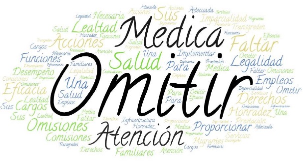 En la nube de palabras que se muestra, se puede apreciar que la mayoría de las personas presentaron quejas por “omisión en la atención médica”, ya que son esas tres palabras las que destacan de todo el concentrado de hechos violatorios proporcionado por la Comisión Nacional de los Derechos Humanos en su oficio CNDH/P/UT/0966/2021 de fecha 10 de junio de 2021