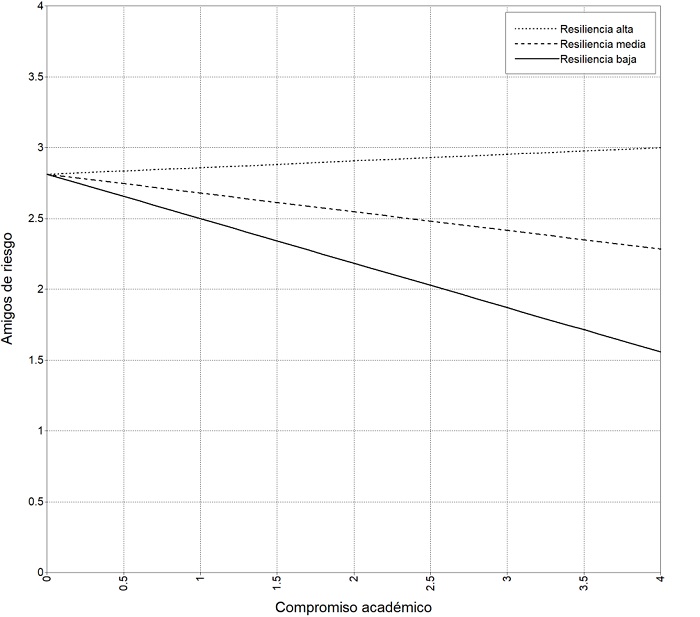 Nota. Con este análisis se puede determinar si los efectos de los amigos de riesgo sobre el compromiso académico varían en función de las disposiciones a la resiliencia.