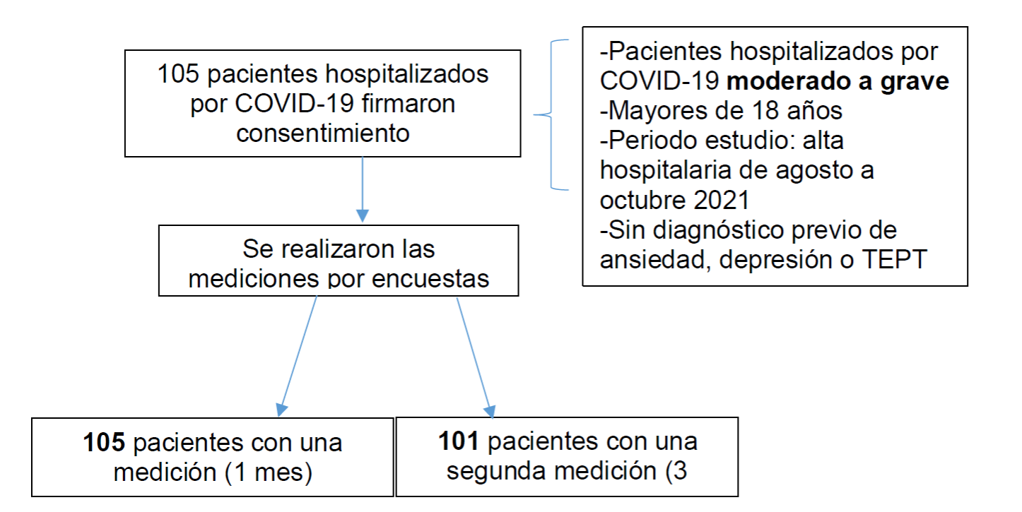 Se incluyeron 101 personas mayores de 18 años de ambos sexos que hayan tenido COVID-19, diagnosticado por PCR o prueba de antígenos de SARS-COV-2, y que hayan requerido hospitalización por necesidad de sistema de presión positiva continua en las vías respiratorias, ventilación mecánica no invasiva o intubación orotraqueal. Es decir, se realizó un muestreo probabilístico por conveniencia incluyendo a las personas que enfermaron por COVID-19 de moderado a grave, dados de alta por mejoría clínica en los meses de agosto, septiembre y octubre de 2021 durante la tercera ola de la pandemia, previa firma de consentimiento informado. Se excluyeron a pacientes con diagnóstico previo de ansiedad, depresión o TEPT, y se eliminaron a pacientes que no cumplieron las dos mediciones (ver Figura 1).