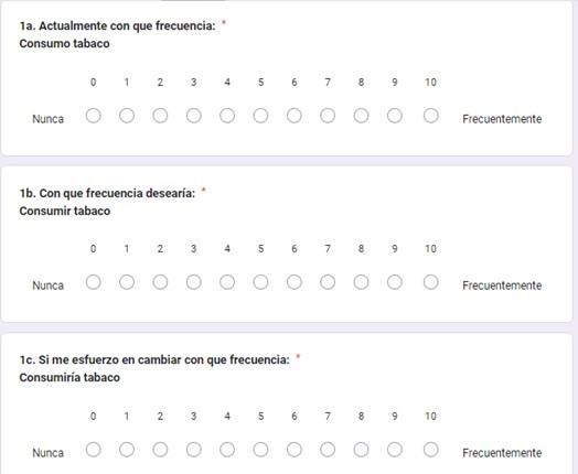 El estudio se realizó utilizando la escala sobre el cuidado de la salud física (ECSF), desarrollada por Blanco en 2010 y validada en población mexicana por Guedea et al. (2017). Este cuestionario tipo Likert consta de nueve ítems agrupados en tres factores: hábitos saludables, hábitos no saludables y estrés. Utiliza una escala de 0 a 10, permitiendo a los encuestados indicar la frecuencia con la que realizan o manifiestan ciertas conductas. Se consideran tres escenarios distintos: actual, ideal y de cambio (Figura 1).