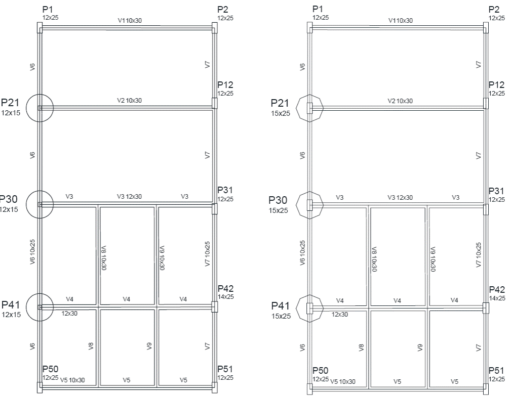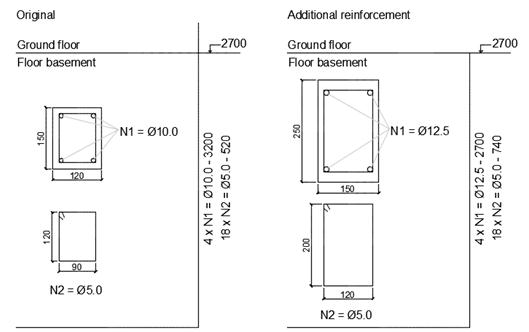 Figure 2 Location and dimensions of columns P21, P30 and P41 before and after structural strengthening (right).