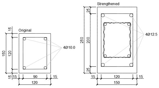 The longitudinal and transverse reinforcement (stirrups) before and after the structural strengthening of the columns were composed of steel bars with diameters, numbers and spacing presented in Table 2. The concrete cover for the columns was 25 mm and 15 mm at the short and long sides' dimensions, respectively. Figure 6 shows details of the cross sections of the columns before and after the structural strengthening with reinforced concrete jacketing, and Figure 7 shows details of the transverse and longitudinal bars. The columns P21, P30 and P41 were only strengthened in the basement floor length because these columns presented safety factors below the recommended by the Brazilian standard for reinforced concrete structures design for the future loadings. Figure 8 shows the placement of the reinforcements, where it is possible to see that, despite efforts to preserve as much original architecture, the smaller final dimensions of the columns, plus the 20 mm thick coating mortar layer, would be greater than the wall thickness.