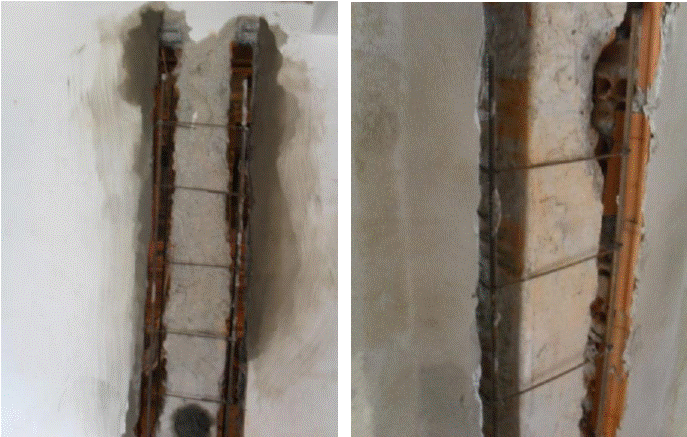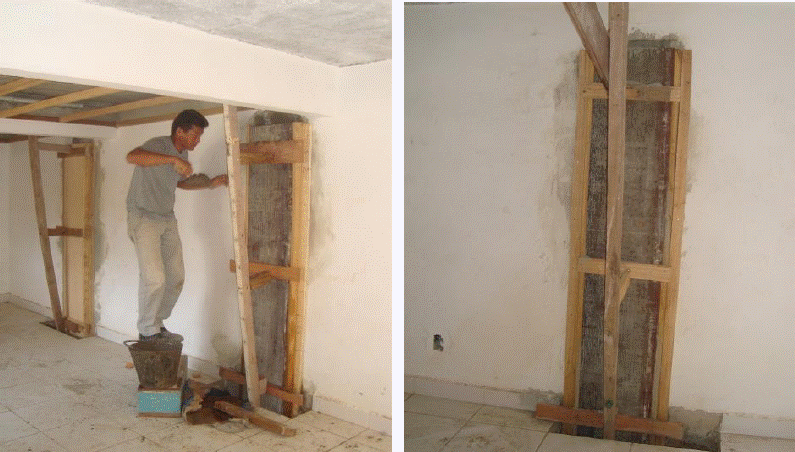 So that there was greater adherence between the old and new concrete its surfaces of the columns were wet before the concrete casting. The concrete was carefully released (Figure 9) and the density was achieved with immersion vibrator with a head diameter of 20 mm, first in 50% of the volume of concrete cast in each column and then the remaining volume. After removal of the wooden mold the columns received a mortar coating layer to allow the finishing, or painting. Figure 10 shows the final appearance of the columns with smaller dimensions exceeding in 35 mm the wall thickness.