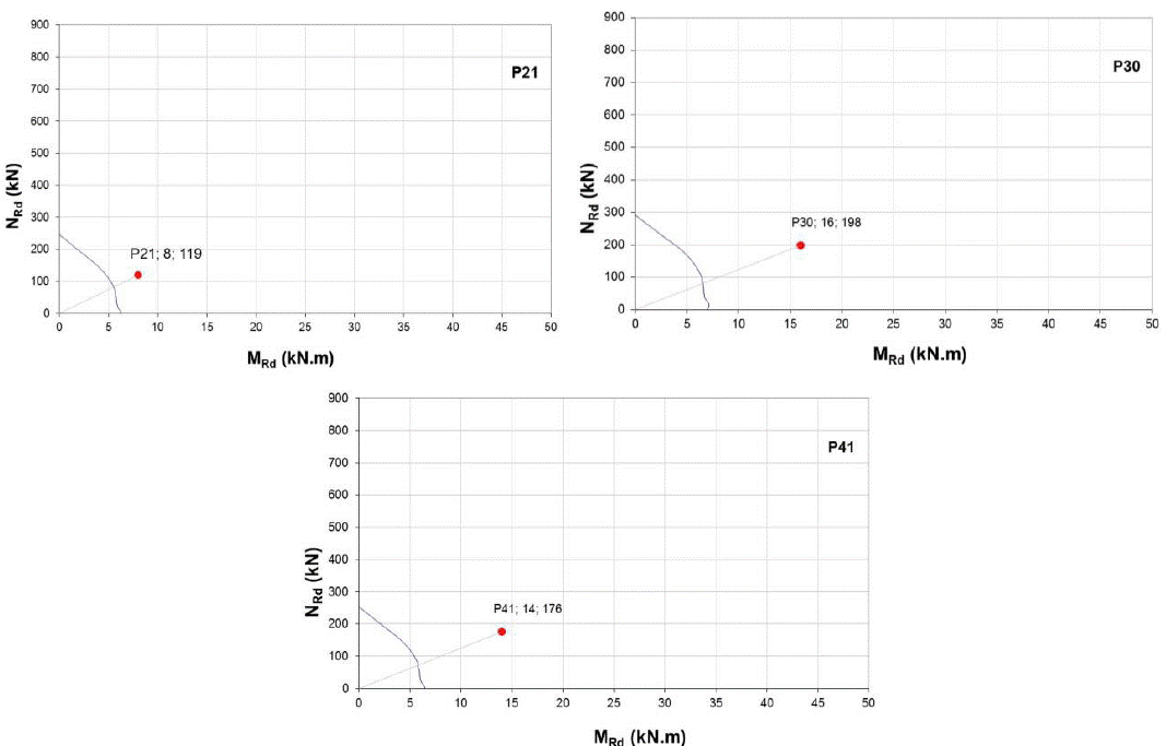 Normal acting force (NSk ) was obtained from Altoqi Eberick 2002 software and the results found with the preliminary analysis for the safety factors of the columns P21, P30 and P41 before strengthening not meet the normative safety requirements, as shown in Table 4. Figure 11 shows the interaction envelopes of resistant forces of these columns, i.e. the consideration of acting and resistant characteristic bending moments without any coefficient of increase or decrease in these actions. In this case, it is observed that the bending moments are more important and destabilize the columns (Marí & Hellesland, 2005), which did not occur because the current actions were lower than those considered in the structural design up to now. It is also possible to conclude with more refined analysis that the progress of corrosion on the flexural reinforcement could significantly reduce the resistant capacity of the columns to flexure and even if the maximum designed loads did not occur, small additions could cause the loss of stability of these columns (Tang & Yang 2011), evidencing the need to strength these structural elements.