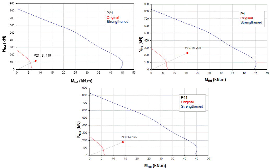 Columns' design safety factors for P21, P30 and P41 strengthened columns was based on the prescriptions of NBR 6118 (ABNT, 2014) following the same criteria used for the original columns without strengthening. The results are presented through the interaction envelopes of Figure 12. The safety factors of each column were determined by the ratio between the length of the straight line from the origin to the outer envelope, passing through the acting loads point, and the distance from this point to the origin, and results are presented in Table 5.