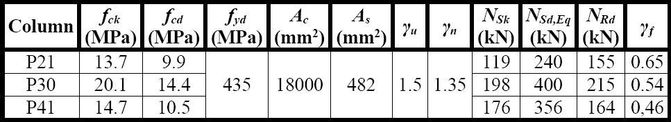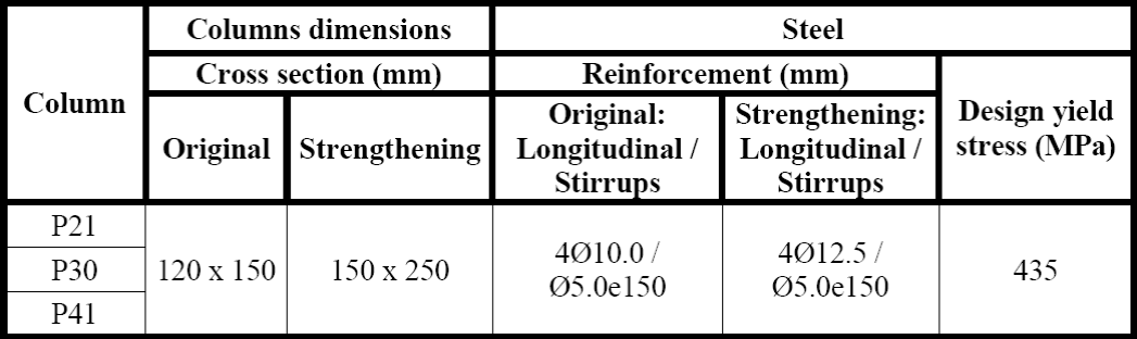 The calculation methodology to check the columns' safety with and without structural strengthening followed the prescriptions of NBR 6118 (ABNT, 2014). A simplified analysis which were determined and compared only the normal loading and resistant capacity for P21, P30 and P41 columns before the strengthening with its normal loading force multiplied by γ u (Equation 1) and an additional increase coefficient (Equation 2). Since design normal resistant force was determined by Equation 3, Equation 4 was used to determine the concrete's design compressive strength (fcd ) and Equation 5 enables the determination of the safety factor for each column.