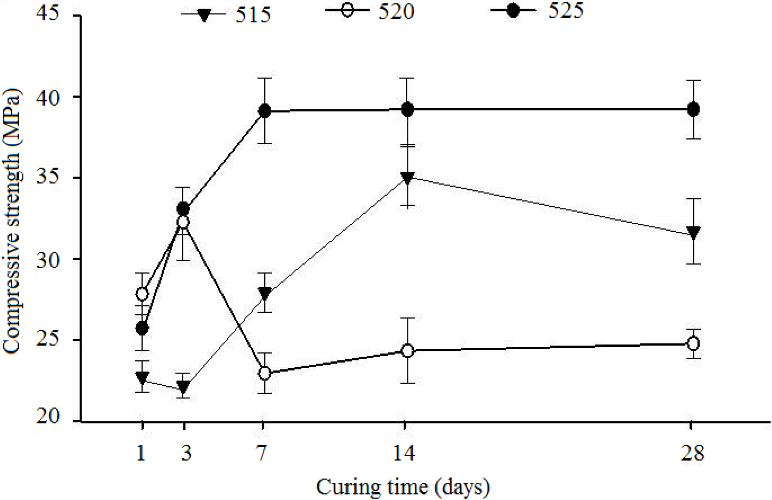 Figure 2 shows the compressive strength results of systems 515, 520, and 525 cured from 1 to 28 days at 40 ºC. In system 515, a gradual development of the compressive strength was observed from day one and up to 14 days; at 28 days the compressive strength decreased, favored by the delayed ettringite formation. System 520 showed a decrease in compressive strength at 7 days with a slight increase at 14 and 28 days; however, a low strength developed ending with 24.25 MPa. In system 525, an increase in the compressive strength was observed in function with time (from 1 to 14 days); at subsequent times it remained at the same strength of 38.9 MPa at 28 days. It is possible that ettringite formed almost in full during the first days of curing, and the subsequent increase is due to the growth of this stage within the pores weak zones (micro-cracks). The presence of gypsum and CSA residue in the days following the start of the curing process indicates that the hydration reactions shall continue with the passage of time. This system showed the best compressive strength values. Based on the aforementioned, a greater quantity of gypsum increases the mechanical resistance due to the formation of the largest quantity of ettringite from the first days of curing. The compressive strength results obtained were found within the value established in the standard NMX-C061-ONNCCE-2001 (20-40 MPa at 28 days of curing). The experimentally obtained value for the OPC cement was 38 MPa.