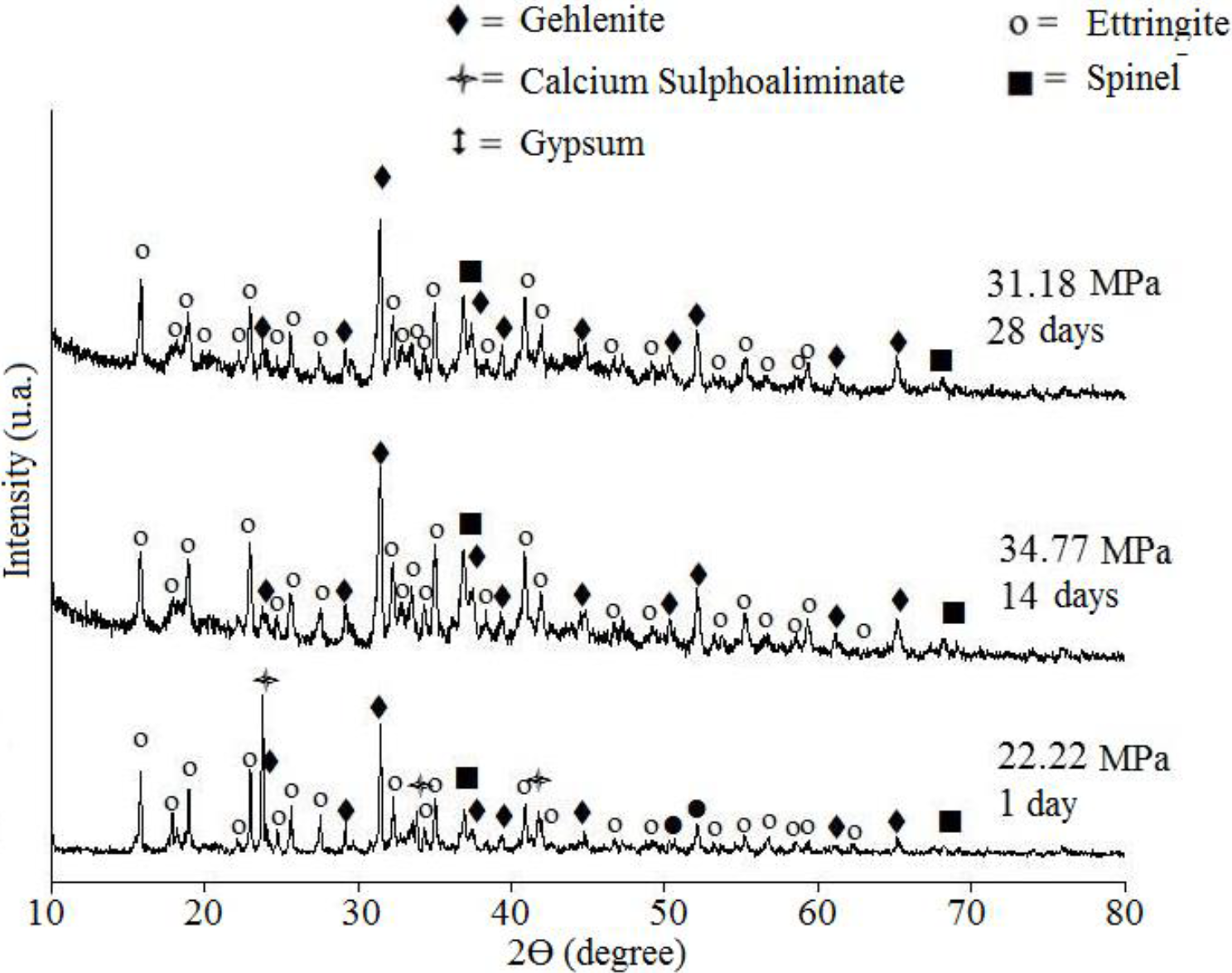 The cements elaborated with calcium sulfoaluminate synthesized from industrial wastes developed compressive strengths of 38.95 MPa, similar to those developed by the Ordinary Portland pastes cured under the same conditions.