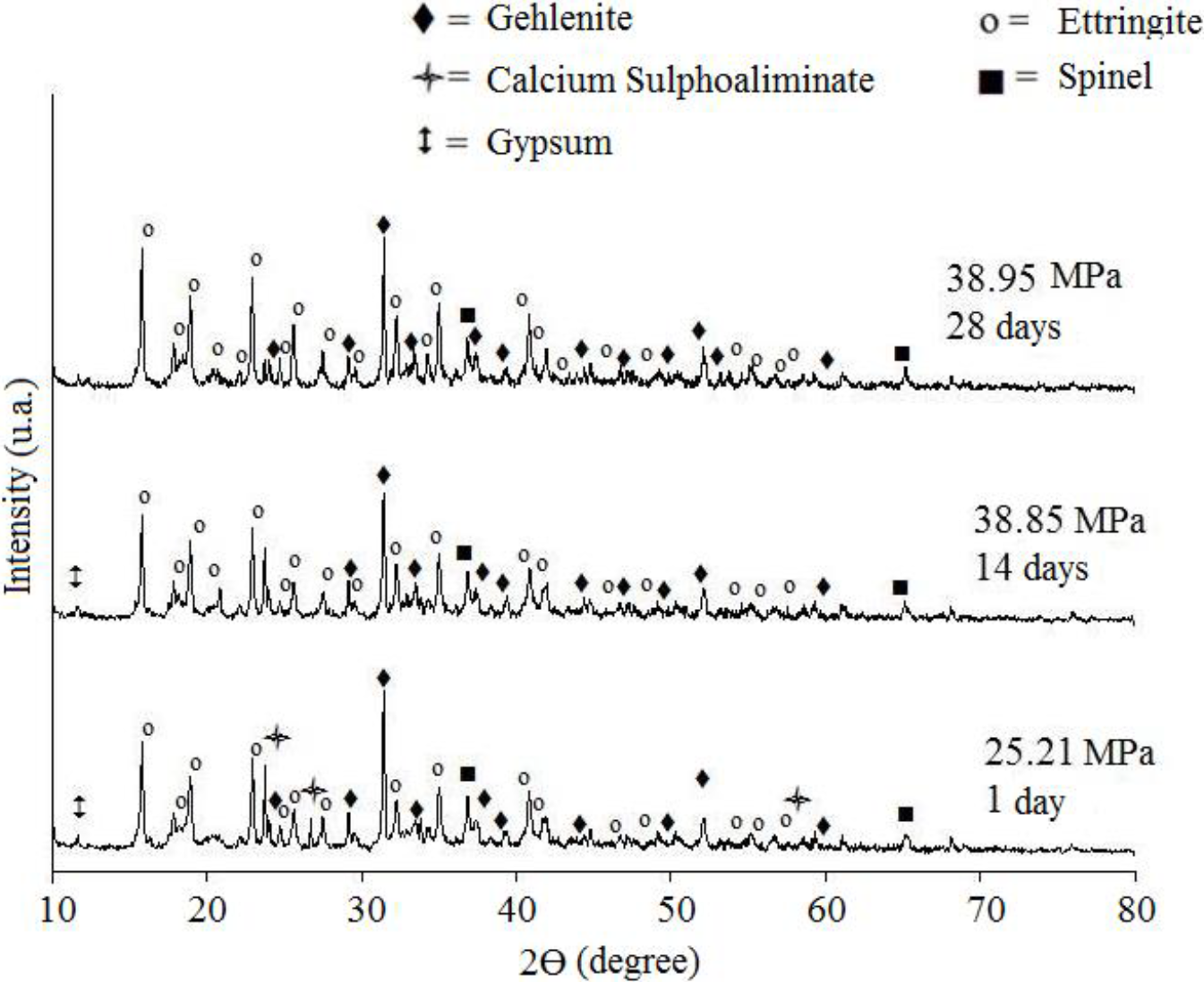 Figures 3 and 4 show the XRD patterns of systems 515 and 525 at 1, 14, and 28 days of curing at 40 ºC. In system 515 (Figure 3), during the first day reflections were observed corresponding to ettringite and these reflections increased in intensity at 14 and 28 days of curing. In system 525 (Figure 4), during the first day reflections were observed corresponding to the CSA and gypsum, these latter reflections were observed up to 14 days later. The reflections corresponding to ettringite were visible from day one and increased in intensity at 14 and 28 days. The gradual increase in intensity of the reflections of the hydration products indicated the delayed ettringite formation. This was not enough to affect the mechanical properties given that the increase of this stage possibly took place within the present pores. For both systems, reflections corresponding to the spinel and gehlenite were observed without apparent changes in the intensity of the reflections in function to the time of curing, due to these two stages being inert in the presence of water.