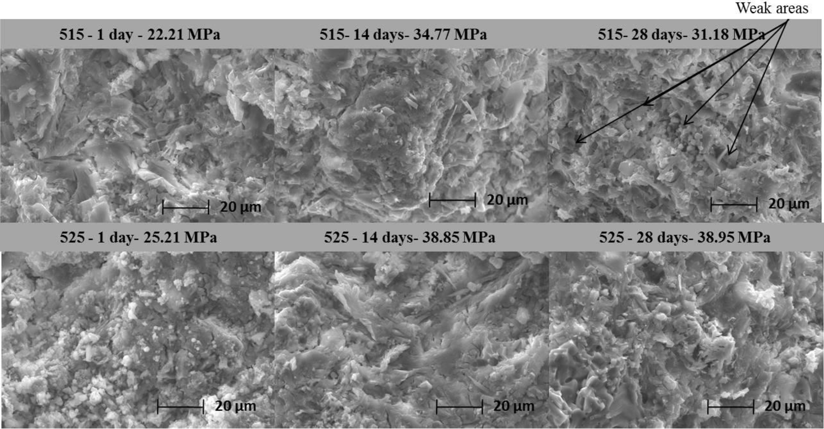 Figure 5 shows the micrographs of fracture surfaces of systems 515 and 525 at 1, 14, and 28 days of curing at 40 ºC. In system 515 during the first day, a dense microstructure is seen with the presence of some cracks distributed in the matrix. At 14 days, a microstructure is observed with a denser and more compact matrix where the cracks decreased in quantity explaining the increase in compressive strength that was presented in the curing time. At 28 days of curing, some weak zones were observed generated by the growth of hydrates giving rise to a decrease in the compressive strength of the material.