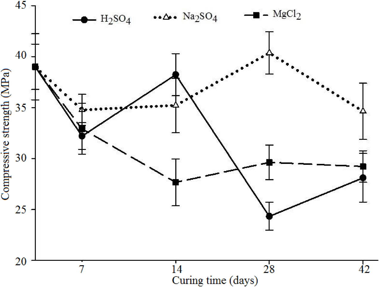Figure 6 shows the compressive strength results obtained from the samples after being immersed in corrosive mediums for 7, 14, 28, and 42 days at 40 ºC. The samples immersed in a solution of NaSO4 0.04 N developed the greatest compressive strength at 42 days of curing (34.63 MPa). The samples immersed in solutions of H2SO4 and MgCl2 developed similar compressive strength at 42 days with values of 28.10 and 29.2 MPa, respectively. A decrease in compressive strength of 28.6 and 25.83% was observed in samples immersed in H2SO4 and MgCl2 solutions, respectively. These variations could be attributed to the interaction of the samples with the Cl-, Mg+2, SO4 -2, and Na+ ions present in the corrosive solutions. The samples immersed in potable water did not show a decrease in compressive strength at any time during the curing (1-28 days).