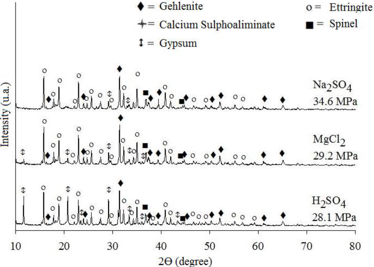 The degradation of pastes by the attack of H2SO4 and MgCl2 occurs by dealumination and decalcification processes. The samples immersed in H2SO4 and MgCl2 developed a compressive strength of 28.10 and 29.2 MPa, respectively, after 42 days of curing.