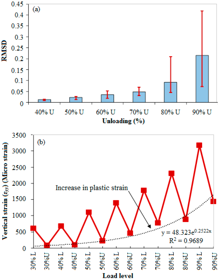 It can be seen that despite the scatter, there is an increasing trend of RMSD with each level of loading as shown in the Figure 5a. The variation in the average vertical strains recorded at the top and bottom of the load cycles obtained from DIC measurements are also plotted in Figure 5b. It can be seen that the level of damage assessed using the RMSD variation of the second resonant peak compares well with the evolution of plastic strain and increase in mechanical compliance. There is an exponential increase in the evolution of plastic strain with loading. Plastic strain is an indicator of level of damage in the material. This corresponds with the observed trend in the RMSD measured with loading.