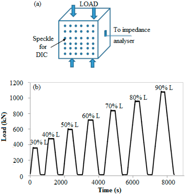 The front faces of the cubes were smoothened and a sprayed-on speckle pattern was created for measurement of surface displacements using the full-field optical technique known as digital image correlation (shown in Figure 1a). The baseline signatures of the PZT when attached to the substrate were taken. 20mm x 20mm PZT patches of 1 mm in thickness were used in the experimental study. In a typical impedance measurement, the frequency was varied between 1 kHz and 0.5 MHz at an applied voltage of 1V and data was collected at 800 discrete frequencies. Average of five measurements was collected. Impedance data was collected from the PZT patch in the free-state before attaching the PZT to the concrete cube. The baseline EM conductance signature and image were taken prior to the start of loading. Cubes were subjected to cyclic compressive loading of increasing magnitude where the load amplitude was increased in increments of 10% of the average compressive strength in every cycle. The loading procedure consisted of alternate loading and unloading cycles as shown in Figure 1b. During the loading, the conductance signatures and the image for DIC were recorded on top of the load cycle and after unloading.
