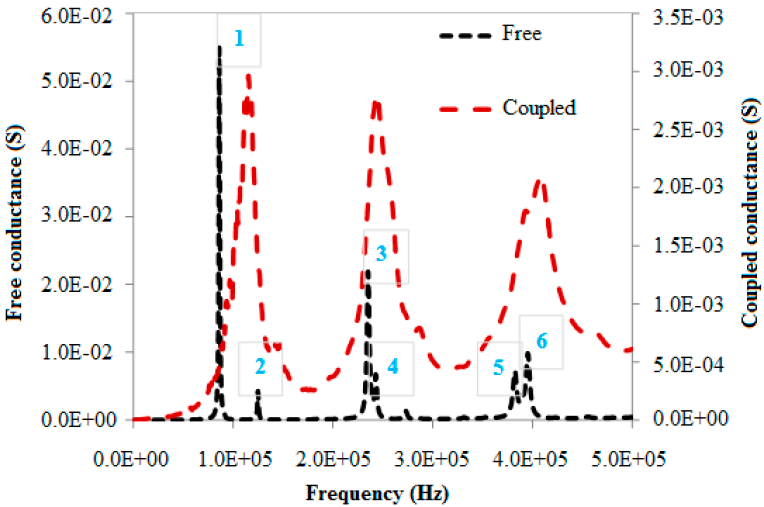 The resonance peaks shift to higher frequencies, with a larger frequency shift in lower modes. The resistance to the motion of the PZT by the substrate is reflected in the overall decrease in the value of conductance. While the conductance of the free PZT is essentially zero between resonant peaks, the conductance is non-zero between the resonant peaks for the bonded PZT. The resistance to the motion of a point located on the surface of the cube, given by the driving point impedance, influences the motion of the bonded PZT. The frequency dependency of the substrate driving point impedance is reflected in the relative shifts in the amplitudes and the general increasing trend in the background of the measured conductance. The influence of the substrate can also be identified with the overall increase in the frequency and broadening of the resonant peaks.