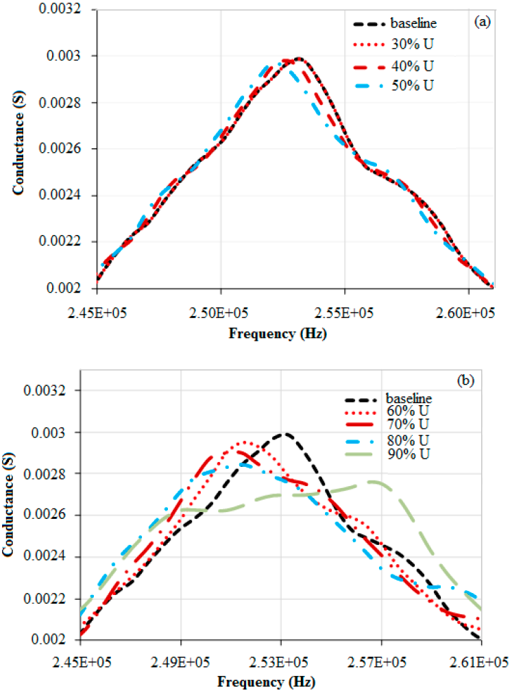 From the results of the numerical analysis of surface bonded PZT carried out in COMSOL multiphysicsTM, the first peak was not well defined for concrete. The second peak was well defined and sensitive to the change in elastic modulus. The second peak in the EM conductance response of the bonded PZT was selected for evaluating the influence of load-induced damage. The conductance signatures at the second peak of the bonded PZT response after unloading from different load levels are shown in Figure 3 a, b.