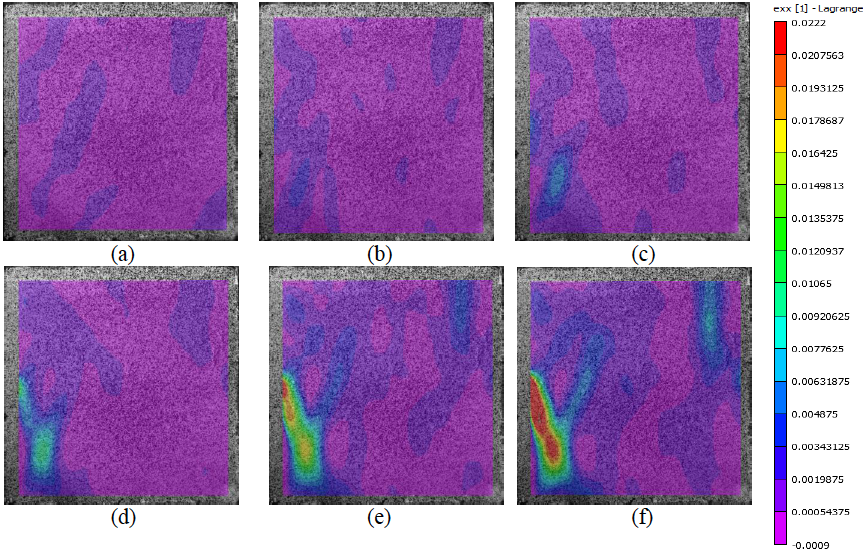 Figure 4 Contours of horizontal strain (exx) obtained using digital image correlation (a) at 40%; (b) at 50%; (c) at 60%; (d) at 70%; (e) at 80%; and (f) at 90% of Strength.