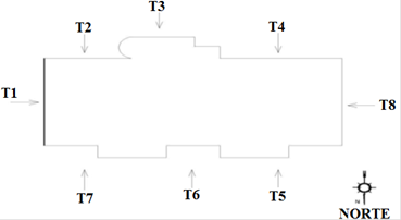 Según se ilustra a Figura 1, la fachada fue dividida en 7 áreas muestrales (trecho T1: fachada este; trechos T2, T3 y T4: fachada sur; trechos T5, T6 y T7: fachada norte y trecho T8: fachada oeste).