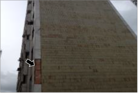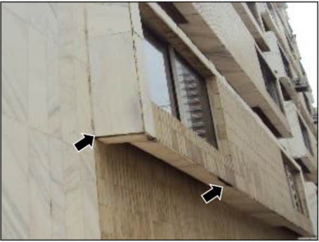La fachada oeste está revestida en mayor parte por la misma cerámica de las demás fachadas, en un paño cerrado, teniendo apenas en los extremos laterales una hilera de remate en mármol blanco rajado. En esta fachada se tiene el registro del desprendimiento de dos placas, justamente en el mármol del remate, mientras que la cerámica permanece íntegra sin tener señales de fallas de adherencia (Figura 5).